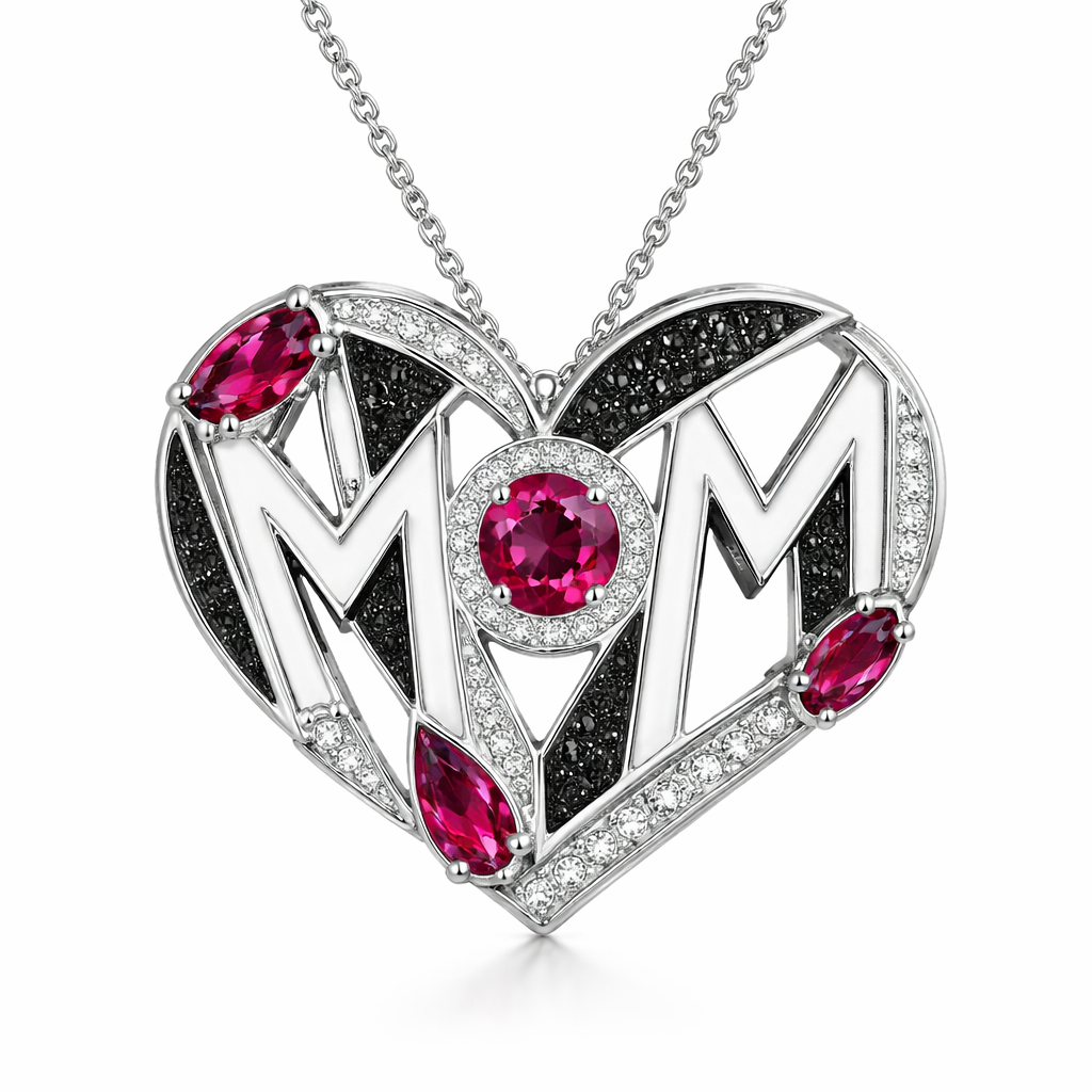 Gemoatric archtictyre pendant of heart shape with written mom in abstract way of white and black and ruby diamonds of white background