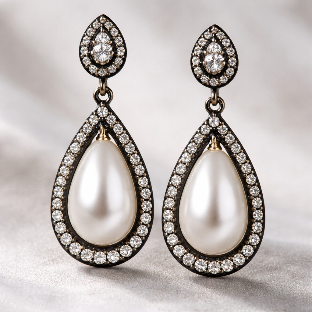 Pear shaped pearl drop earrings with blackened gold gypset border and with pavé diamonds, everyday wear