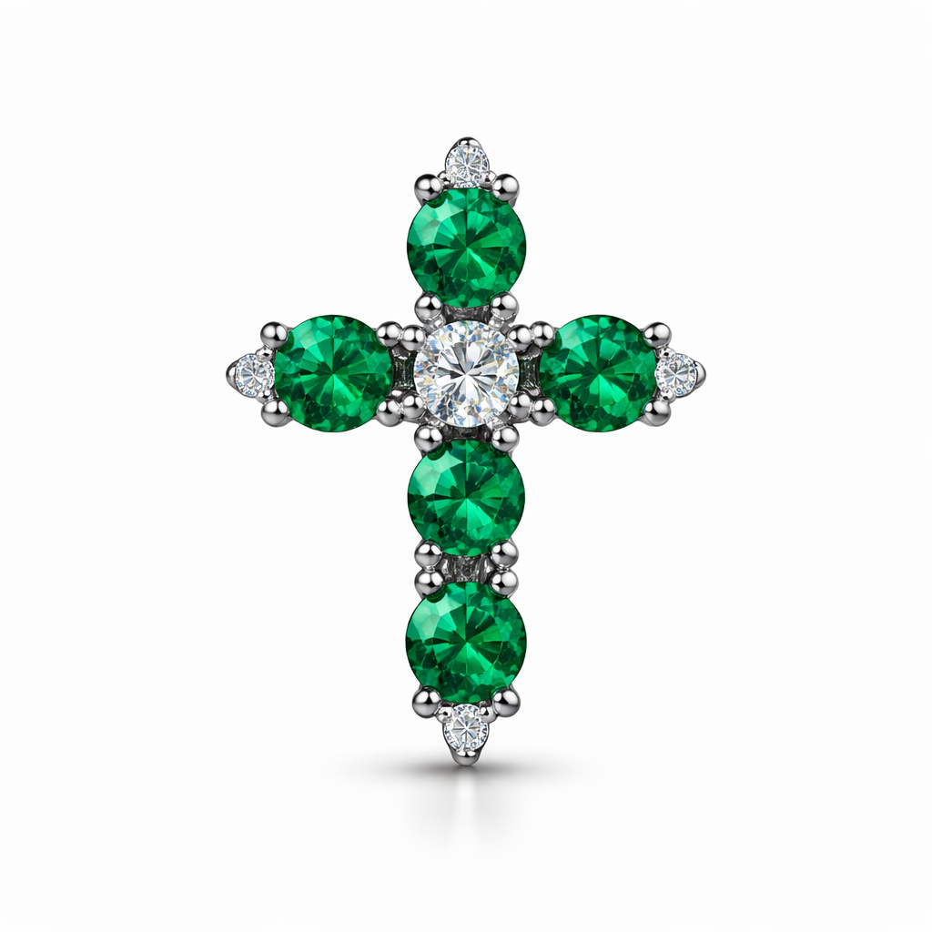 Small rounded Emerald cross with accent diamonds, prong set stones , minimalist style