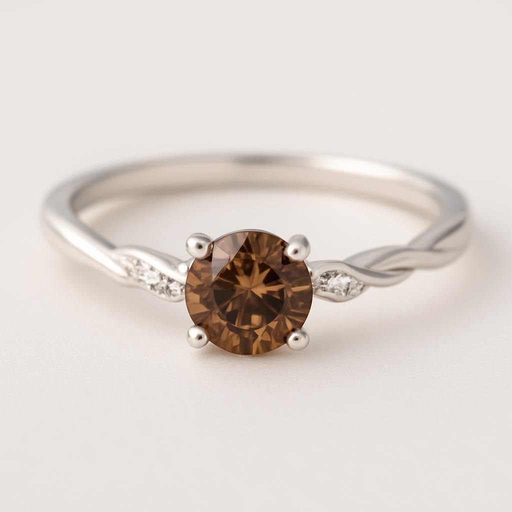 Engagement ring, simple, silver, slight design on band or small stones, twisted band, roasted center stone, for petite hands, less than 1 karat