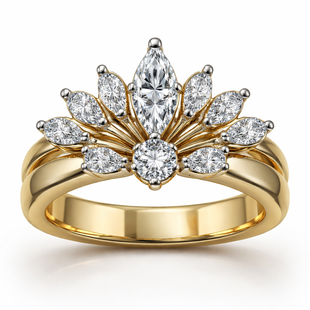 .6 karat marquise centered, with .25 round directly under it with 6 more smaller marquise diamonds and 2 .15 round diamonds mounted on a wide 14k yellow gold band. Make the design in a fan shape and use platinum prongs