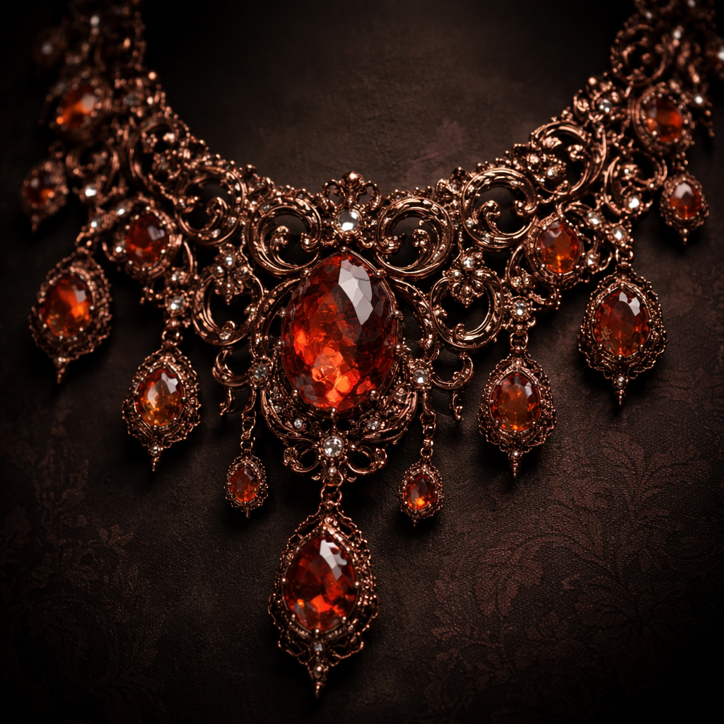 A beautiful extreme dark rose gold necklace with beautiful raw dark blood orange gems, victorian style