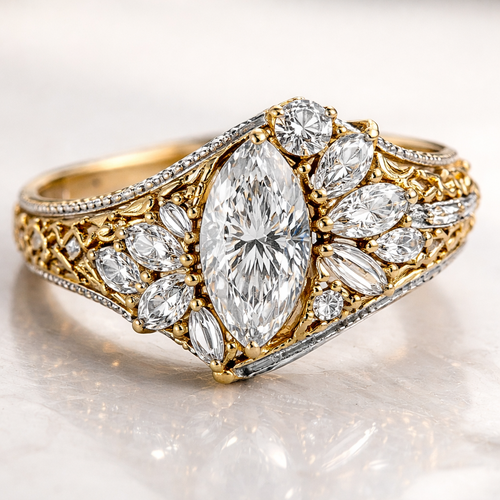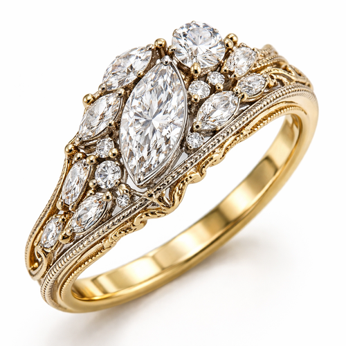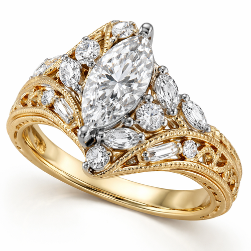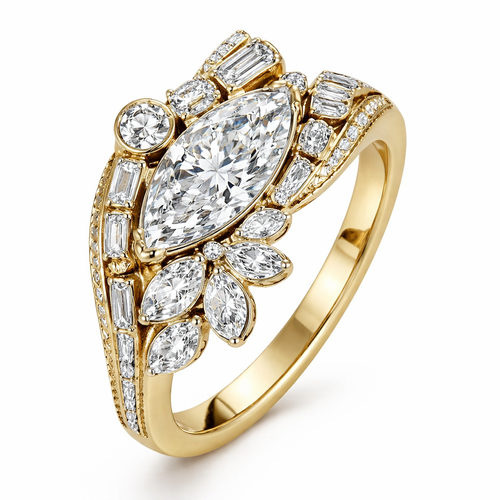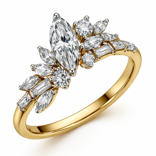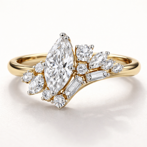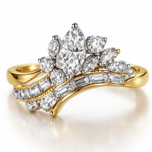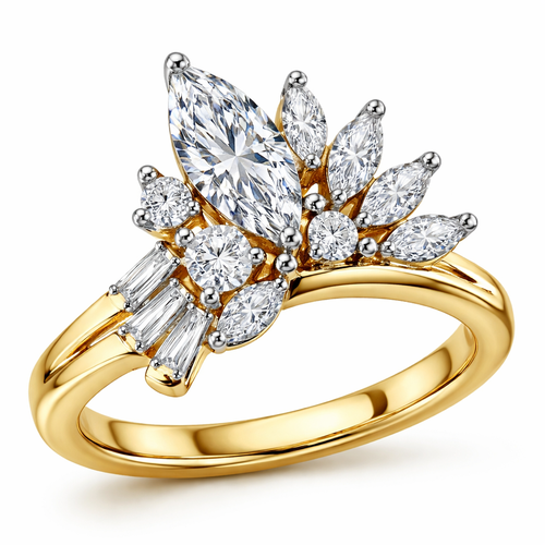 Asymmetrical diamond ring design with 1 .6 marquise , 1 .25 round , 6 smaller marquise, 2 .15 round and 4 .1 baguettes o...