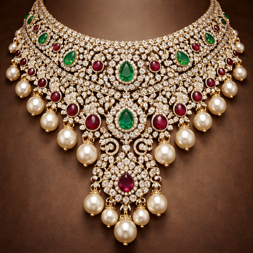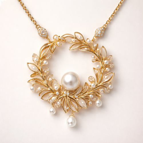 Elegant circular gold necklace inspired by soft floral and pearl shapes, with a modern Emirati touch. The design should ...