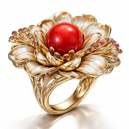 A bold 35mm round statement ring, featuring camellia leaves fully opening outward in a radiant, sculptural form. The ent...