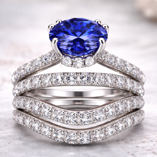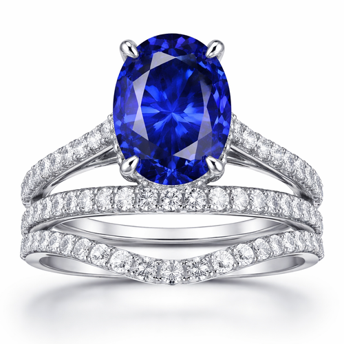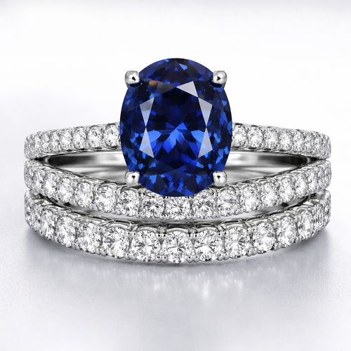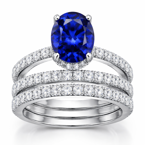 5-6 ct oval lab grown deep blue sapphire with lab grown diamonds going down the band and two more wedding bands attached...