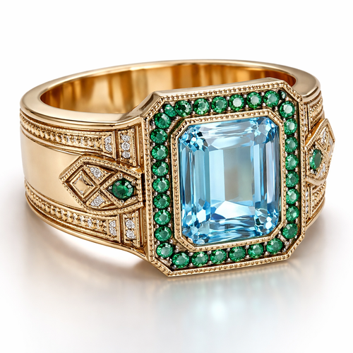 Wide 18 karat gold band with emerald cut, square aquamarine surrounded by small emeralds