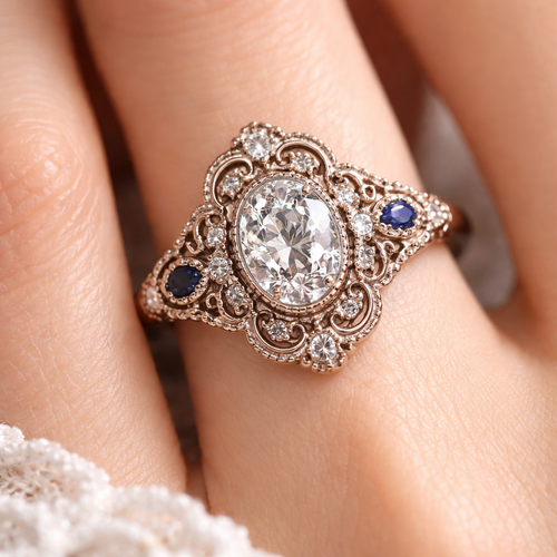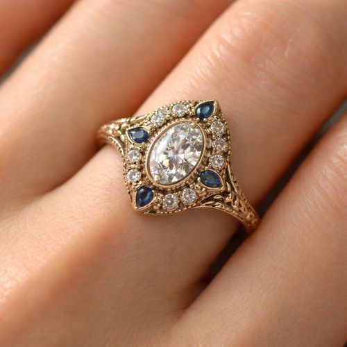 I want an oval lab-created sapphire, around 5-6 carats, in a deep royal blue color I don’t want a rail I do want a hidde...