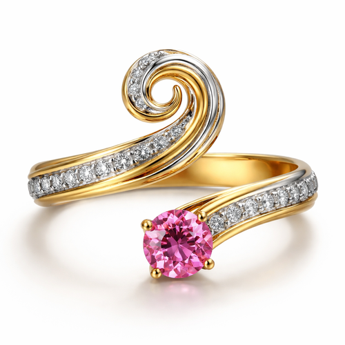 טבעת זהב וכסף מגולגלת ומסולסלת ובסופה אבן חן ורודה