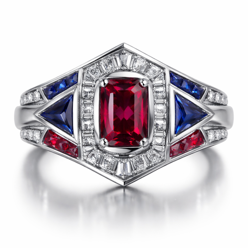 A geometric women's ring made of platinum with ruby and sapphire stones suitable for wedding