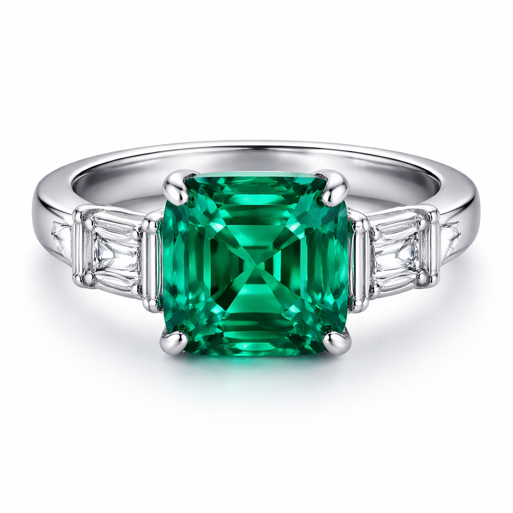 Modern Asscher cut emerald ring set in platinum with two horizontal emerald cut diamonds on each flank