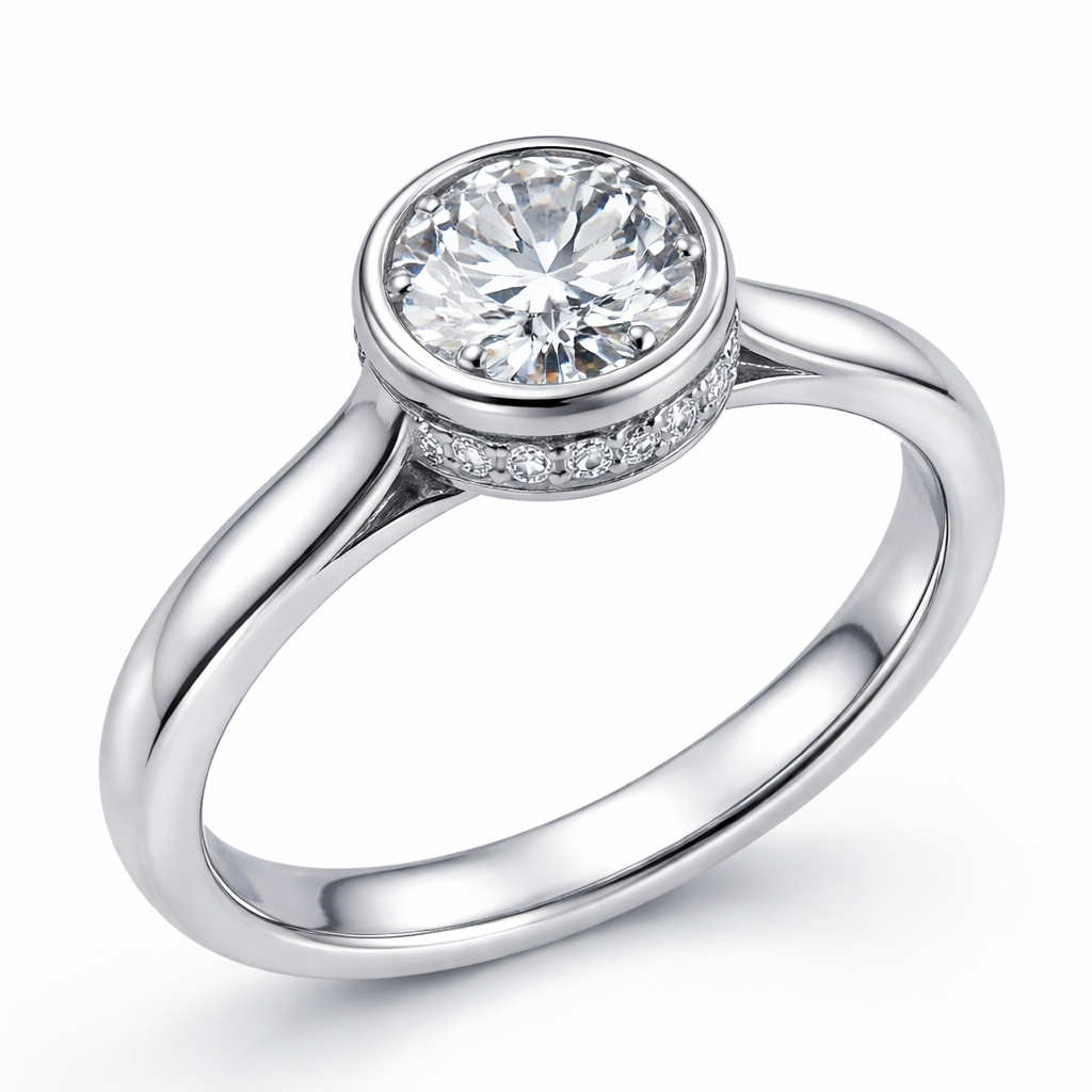 Solitaire diamond set in a white gold bezel with a pave diamond hidden halo in the side of the gold bezel
