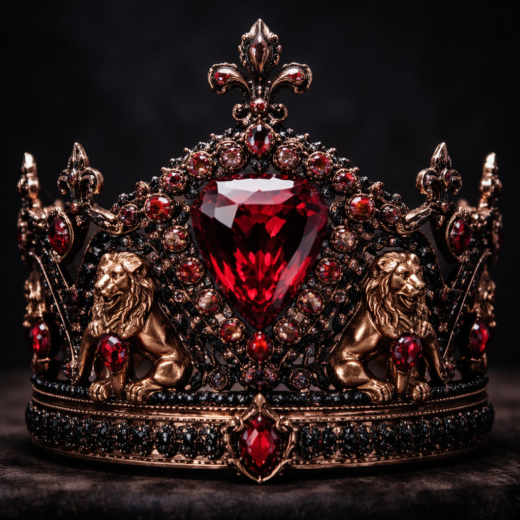 A giant crown with an enormous red diamond in the and painite surrounding with extremely dark rose pink gold and tiny black diamonds. Small red diamonds also stick onto tiny gold lion statues., luxury style