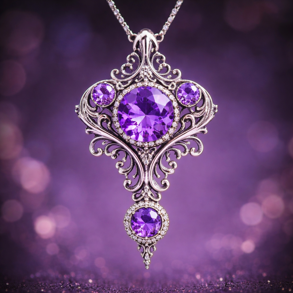 Three round amethyst gems, two small and one larger gemstones in a silver pendant, fantasy style