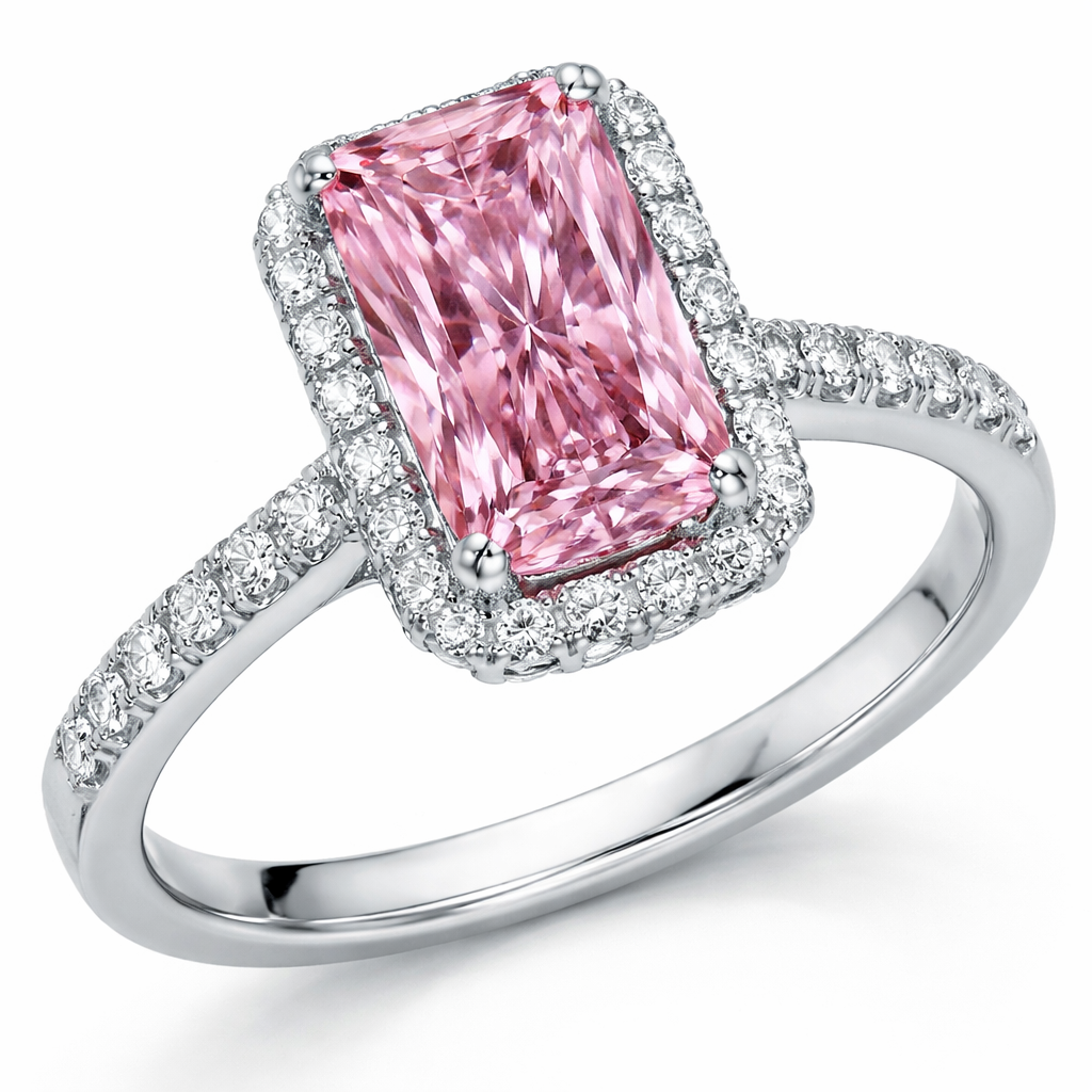 Pink 5ct elongated radiant cut center stone,hidden halo underneath, 1/4 carat round diamonds around a white gold ring
