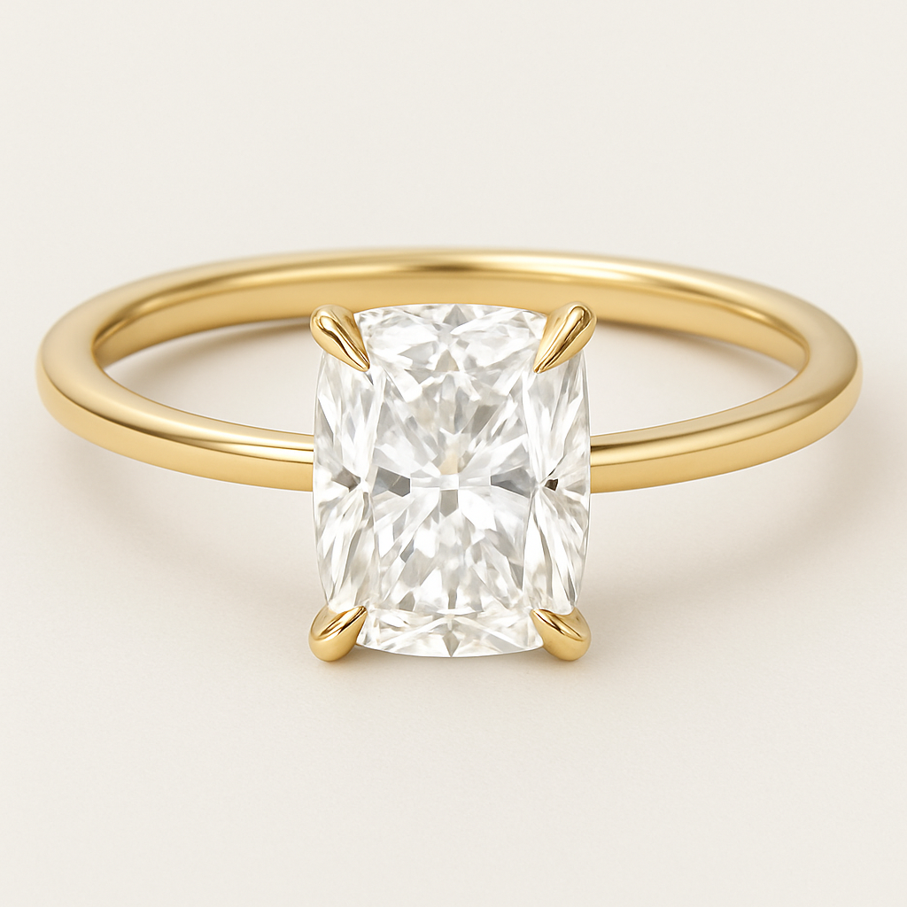 Elongated cushion diamond in yellow gold with Talon prongs at north south east and west Talon prongs, minimalist style
