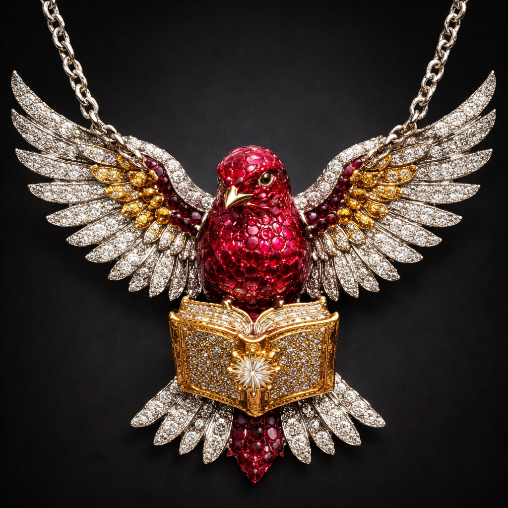 A red sparrow with the wings attached to on each side where the chain connects so the wings are open on the sparrow, and the sparrows made from rubies and diamonds, and the wings are made from silver and gold diamonds and at the bottom it’s holding a book the book is studied withstones of gold and diamonds, and that’s it for now so yeah that, avant_garde style