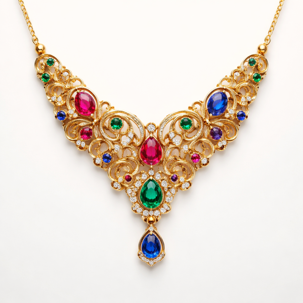 Gold Necklace with with small Ruby, Saphir, emarald, filigran , modern style