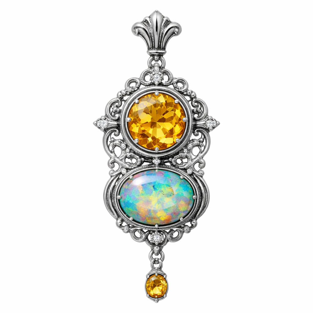 Round citrine and oval opal bezel set in a silver pendant, renaissance style