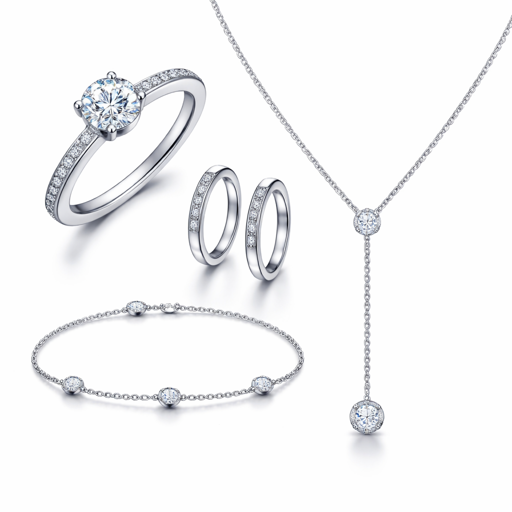 A modern feminine jewelry set crafted from premium stainless steel with a high-polish finish and durable PVD coating. The design features a refined balance between minimal and sparkle elements, including a solitaire ring with a brilliant-cut zircon centerpiece, delicate pavé accents, sleek hoop earrings, a fine bracelet with evenly spaced zircon stones, and a soft drop necklace. The overall aesthetic is elegant, lightweight, and designed for everyday luxury with a soft, sophisticated glow.”