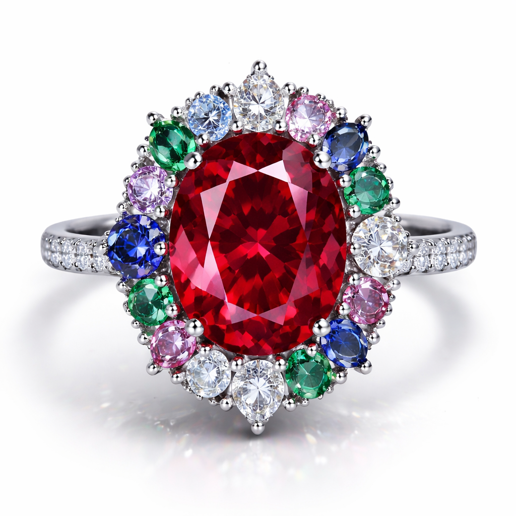 A women's ring. Create another ring with all of those same gemstones that you used in the last design, but put a ruby as the center ring. surprise me with the centerpiece cut add in some smaller stones