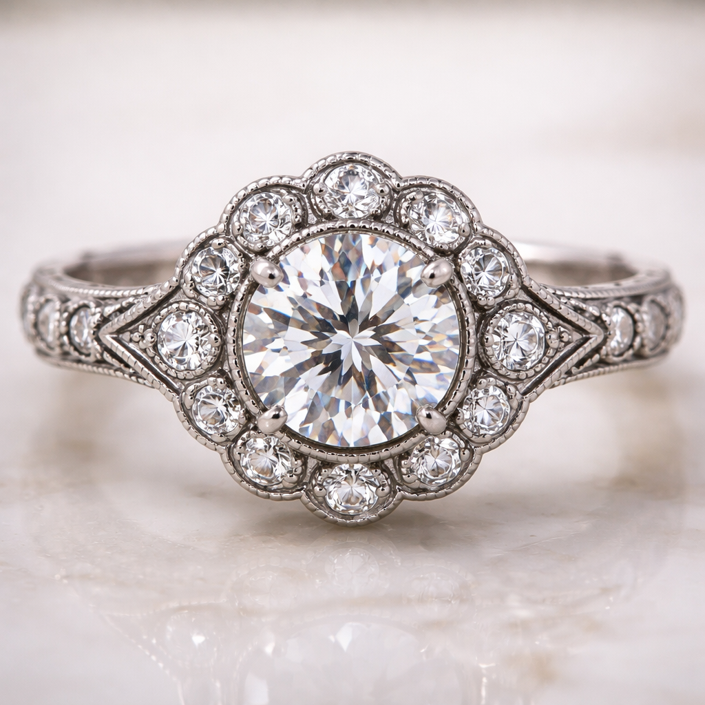 I need a vintage ring with a halo and diamonds on shank, vintage style
