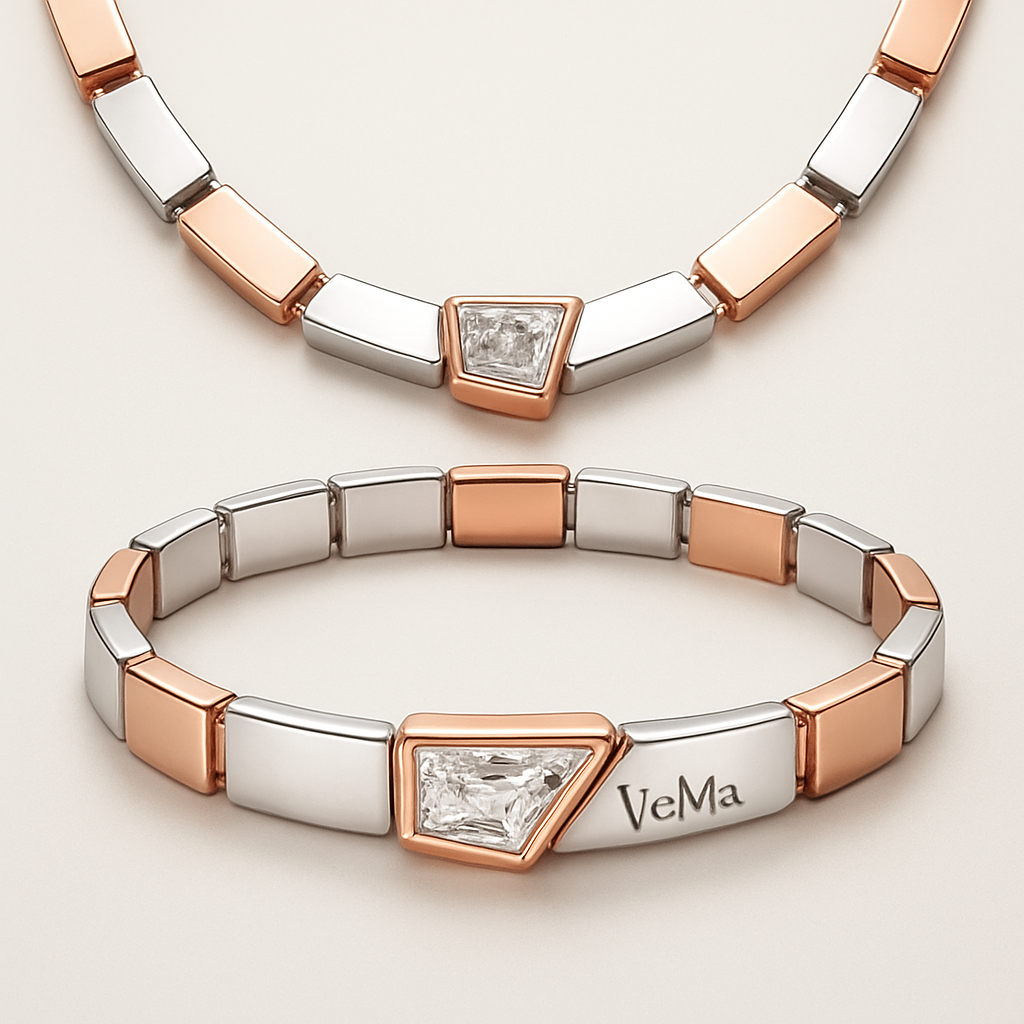 Eckige Kette und Armband 1cm breit in rosé und Silber Front gemischt mit einem Diamanten in Form eines Trapez in weiß und rosa innen Gravur VeMa, luxury style
