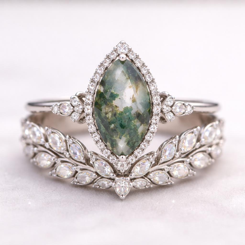 Marqué cut moss agate with mini diamond halo with a small cathedral, on thin white gold band with 3 small diamonds on each side in triangular pattern. Wedding enhancer band with leaf crown on top and bottom with opal and diamonds throughout the leaves