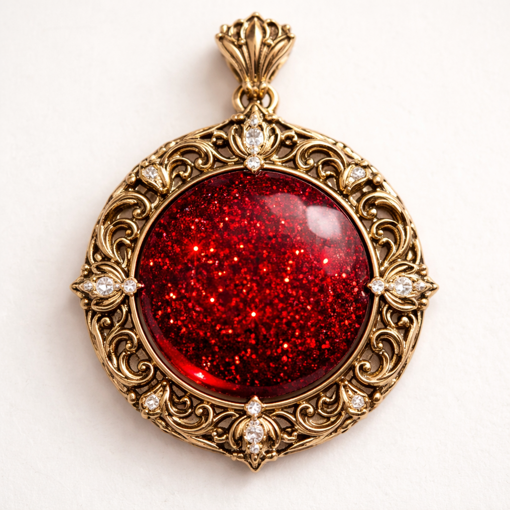 Bloody red glitter round , with golden victorian design around it simple and uniq and elegant