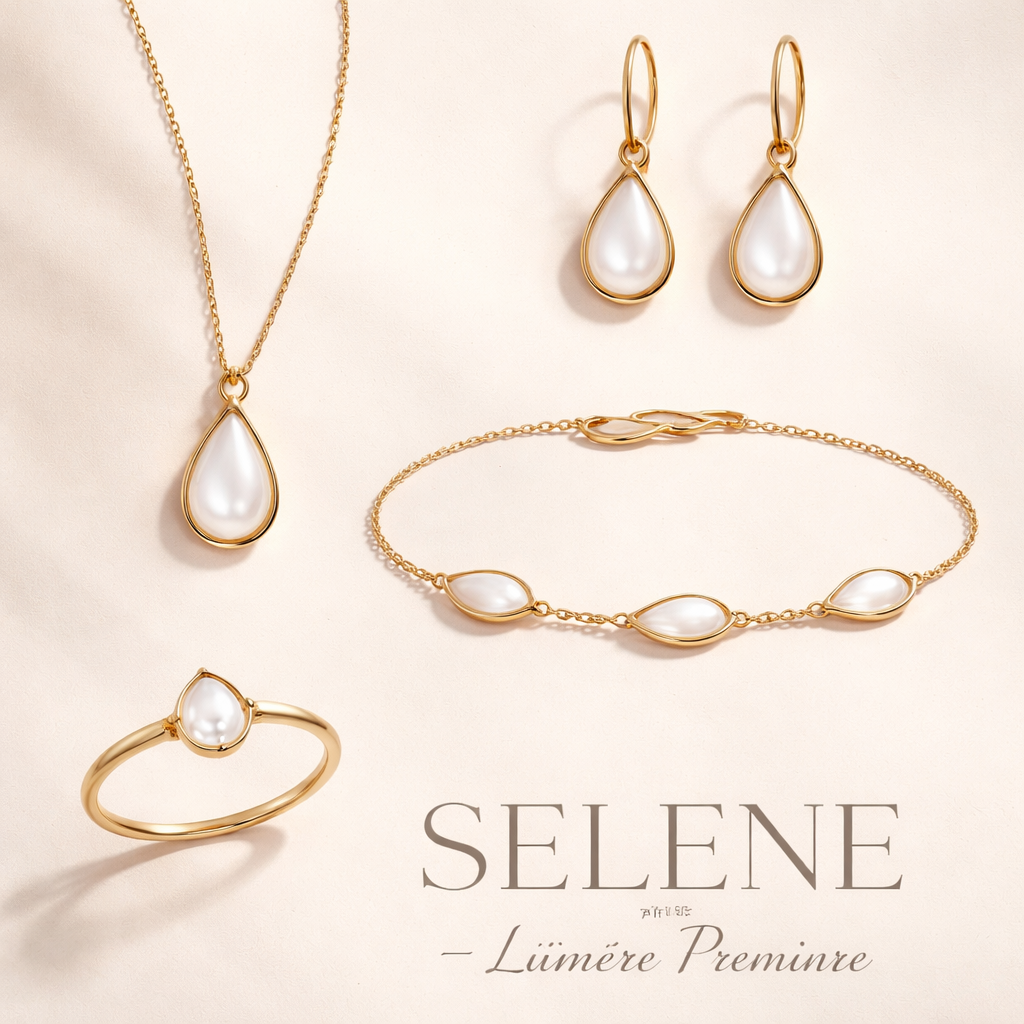 Create a luxury jewelry collection image for a brand named "Selene Paris". Collection name: "SELENE — Lumière Première" IMPORTANT: Keep EXACTLY the same design across all pieces: - teardrop (drop-shaped) design - thin gold outline around the stone - minimalist and refined MATERIAL LOOK: - gold (18K tone, rich and warm) - stone: mother of pearl (nacre), NOT pearl STONE VISUAL: - smooth nacre surface - soft iridescent reflections (natural light) - slightly milky white with subtle rainbow effect SHOW EXACTLY THESE 4 PIECES: 1. Necklace → thin chain + drop nacre pendant 2. Earrings → matching drop nacre earrings 3. Bracelet → thin chain with 3 drop nacre elements 4. Ring → thin ring with drop nacre stone VERY IMPORTANT: - All pieces must have the SAME drop shape design - Keep consistency between all items - Do NOT change style or introduce new shapes ART DIRECTION: - beige / cream background - soft natural light - luxury campaign style - clean composition BRANDING: - "SELENE — Lumière Première" - elegant minimal typography GOAL: Create a cohesive and realistic jewelry collection that looks like a real brand launch, with strong identity and consistency.