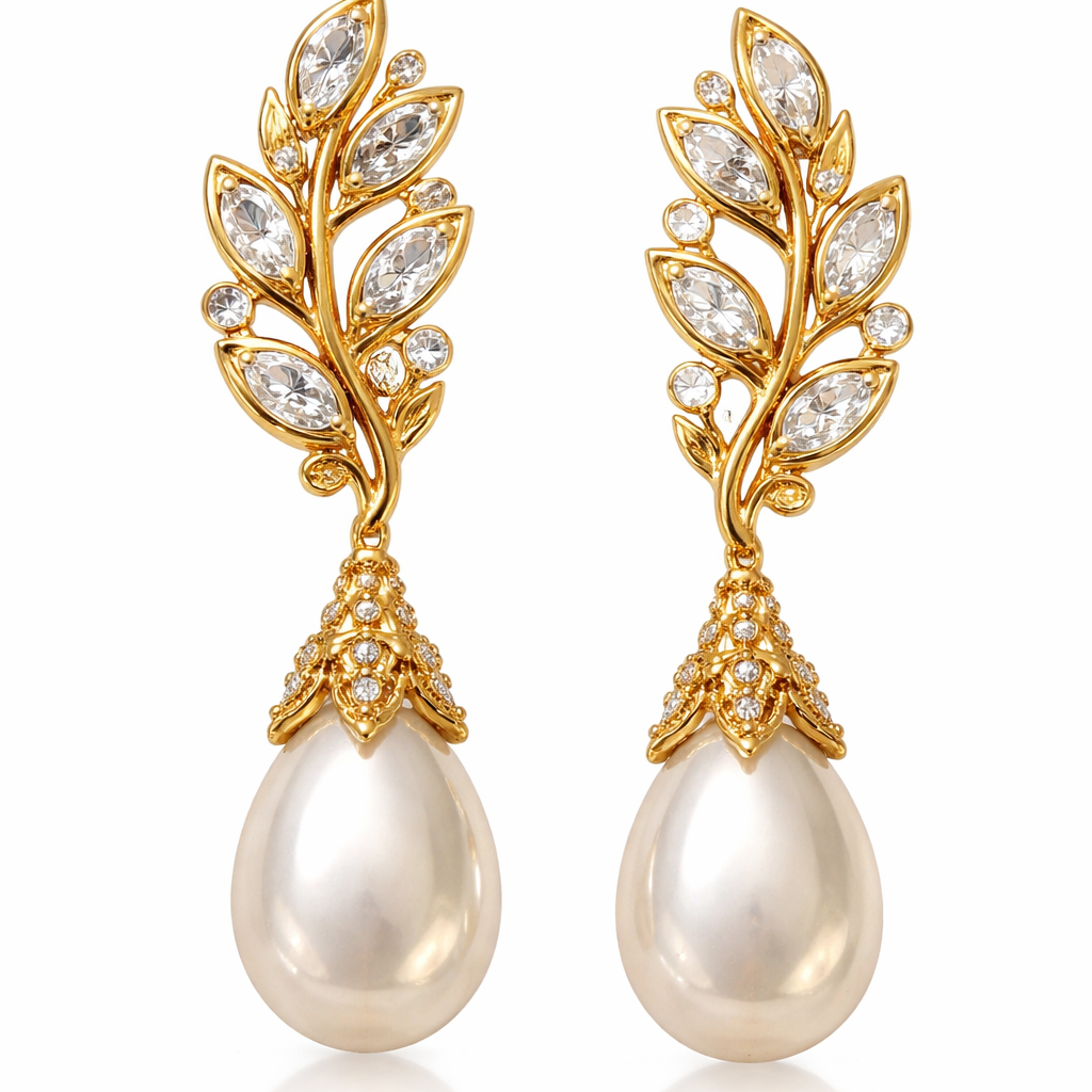 Gold pearl drop earrings with white sapphire stones and make it look like a olive branch , byzantine style