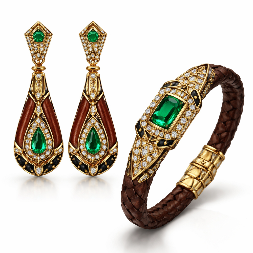 Create pendant earrings and bracelet with leather design and gemstones in gold , art_deco style