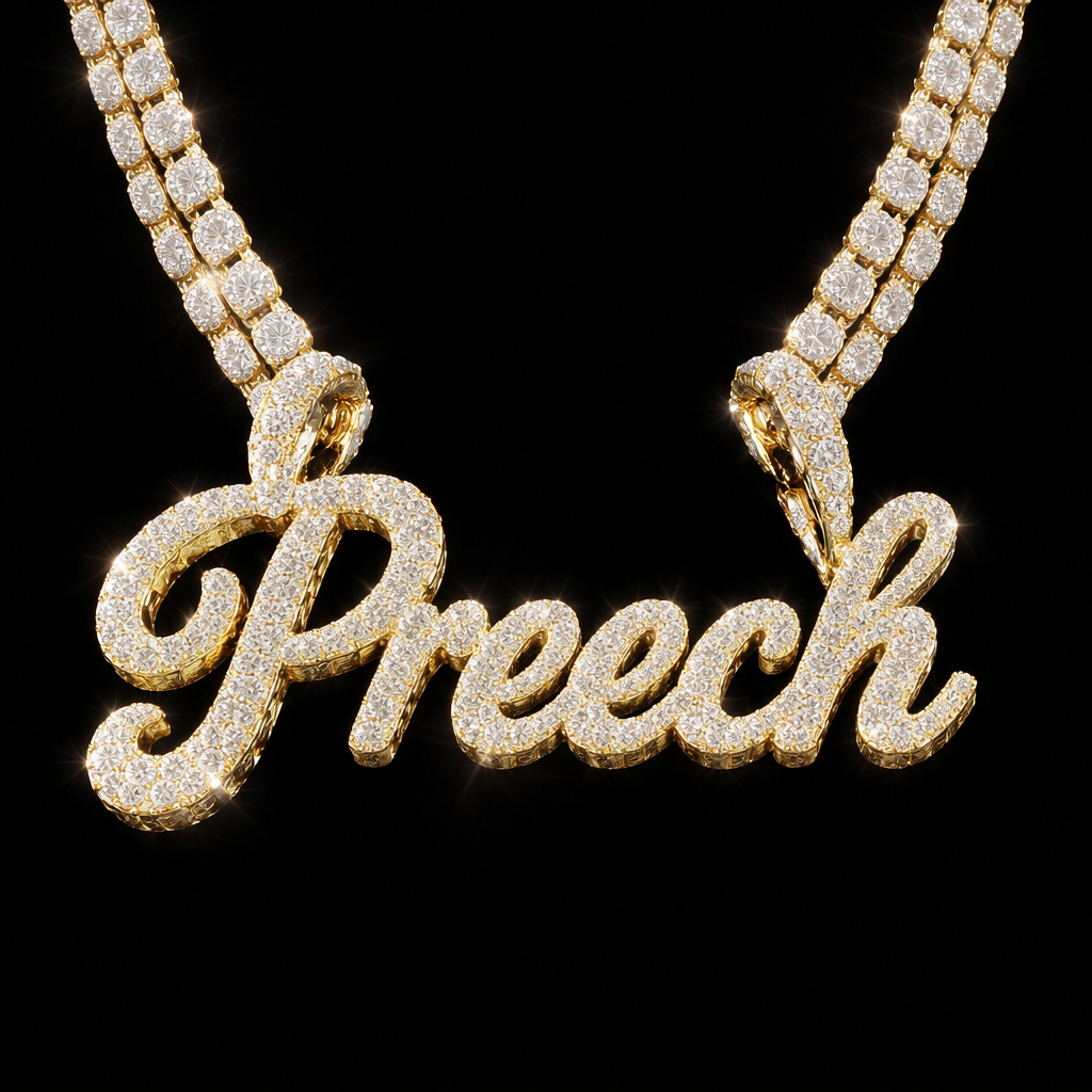 Gold and diamond tennis chain with gold and diamond Preech cursive wind gold and diamond missive noted above the P and H for the chain to loop through, diamond style