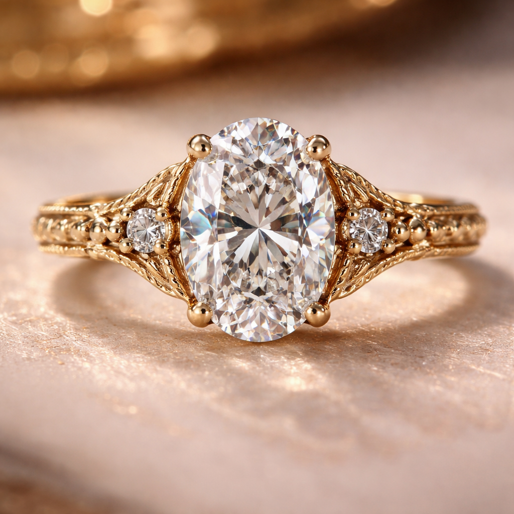 3 carat oval shape diamond on gold vintage elegant, luxury style