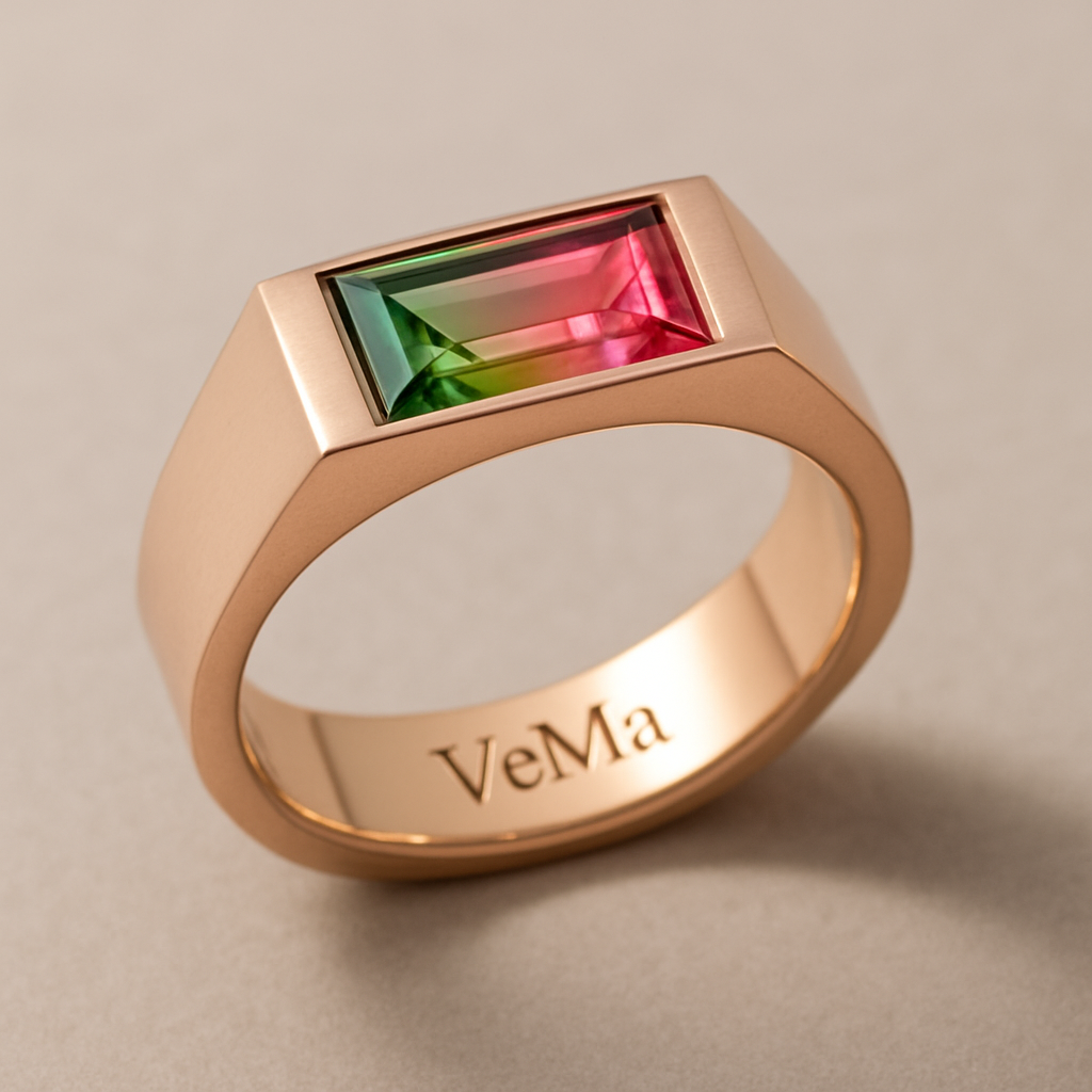 Eckiger Ring 1cm breit in rosé mit einem Diamanten in Form eines Trapez in grün und rosa innen Gravur VeMa, luxury style
