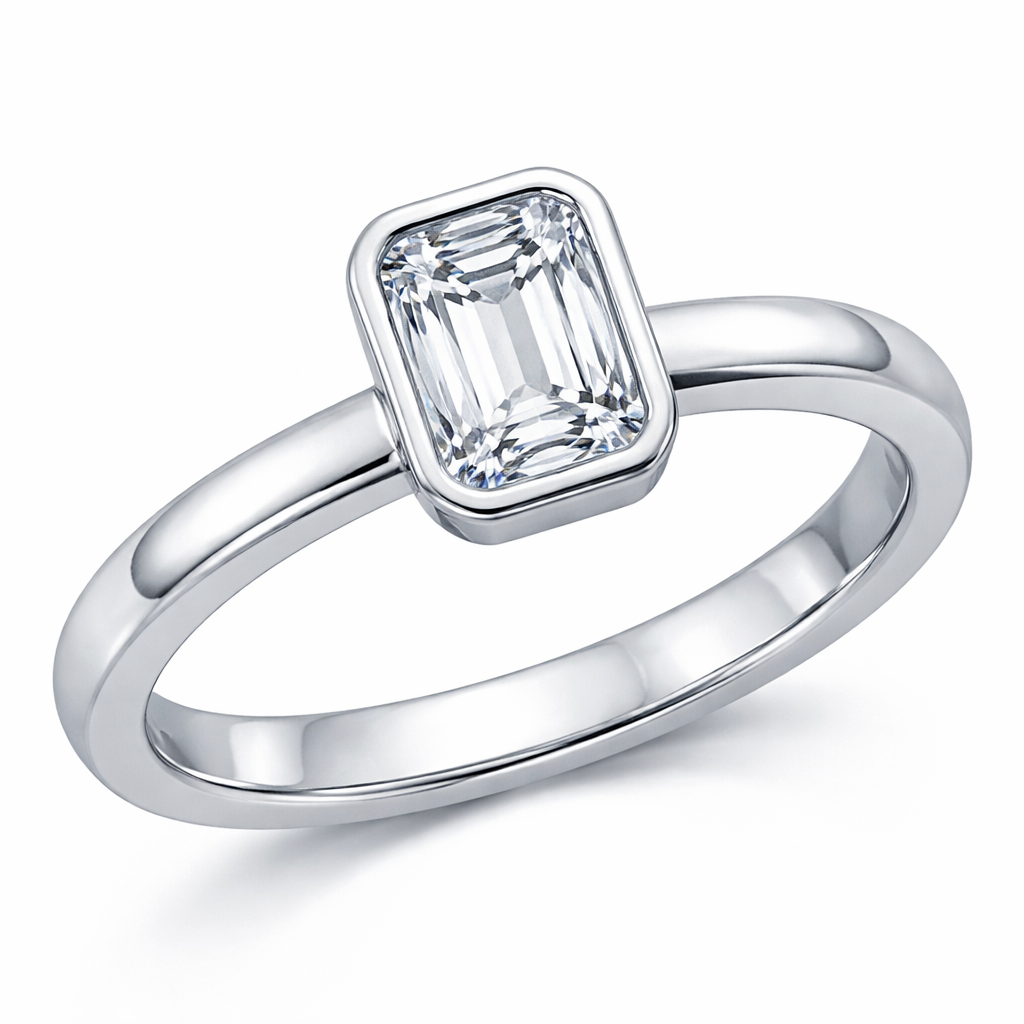 Bezel set emerald cut diamond diamond medium thickness white gold band
