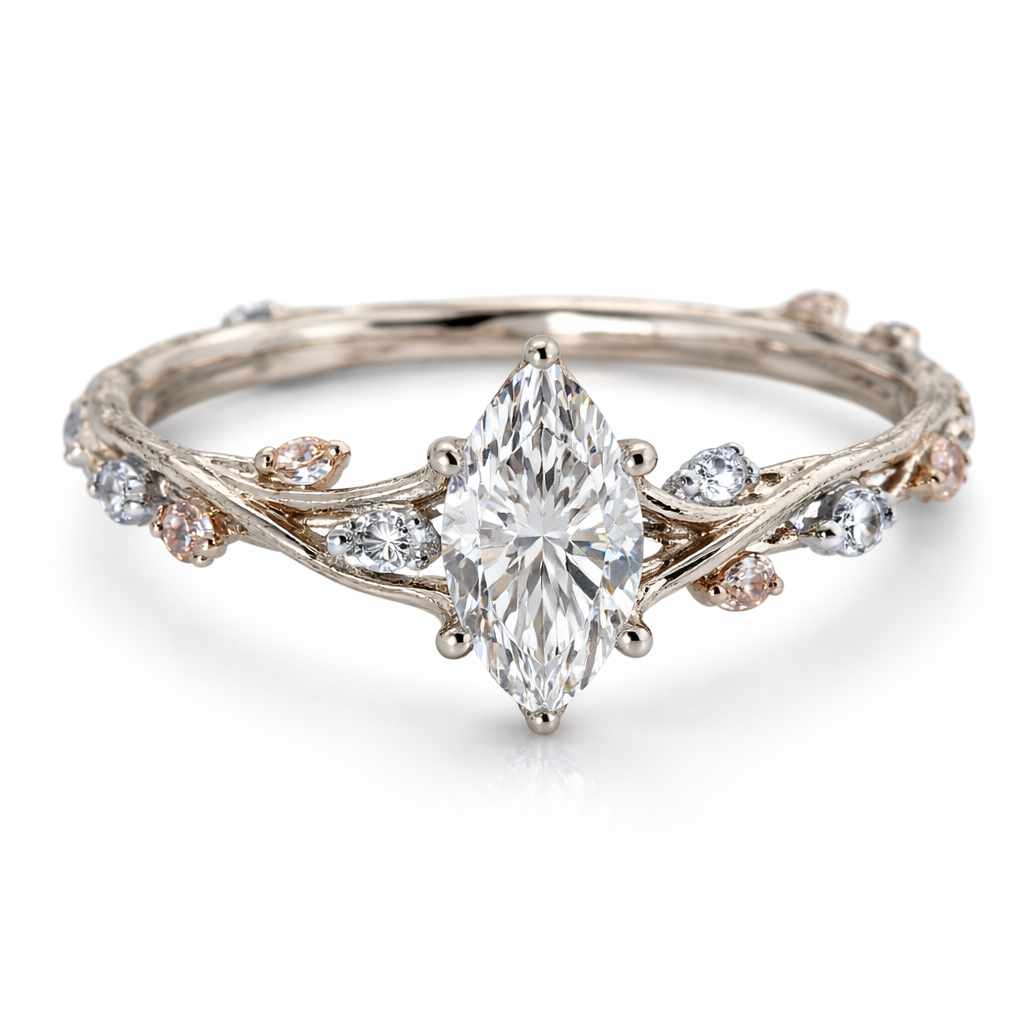 I want a ring where the band looks like a branch, with small gemstones on it, and a gemstone in the center shaped like a diamond.