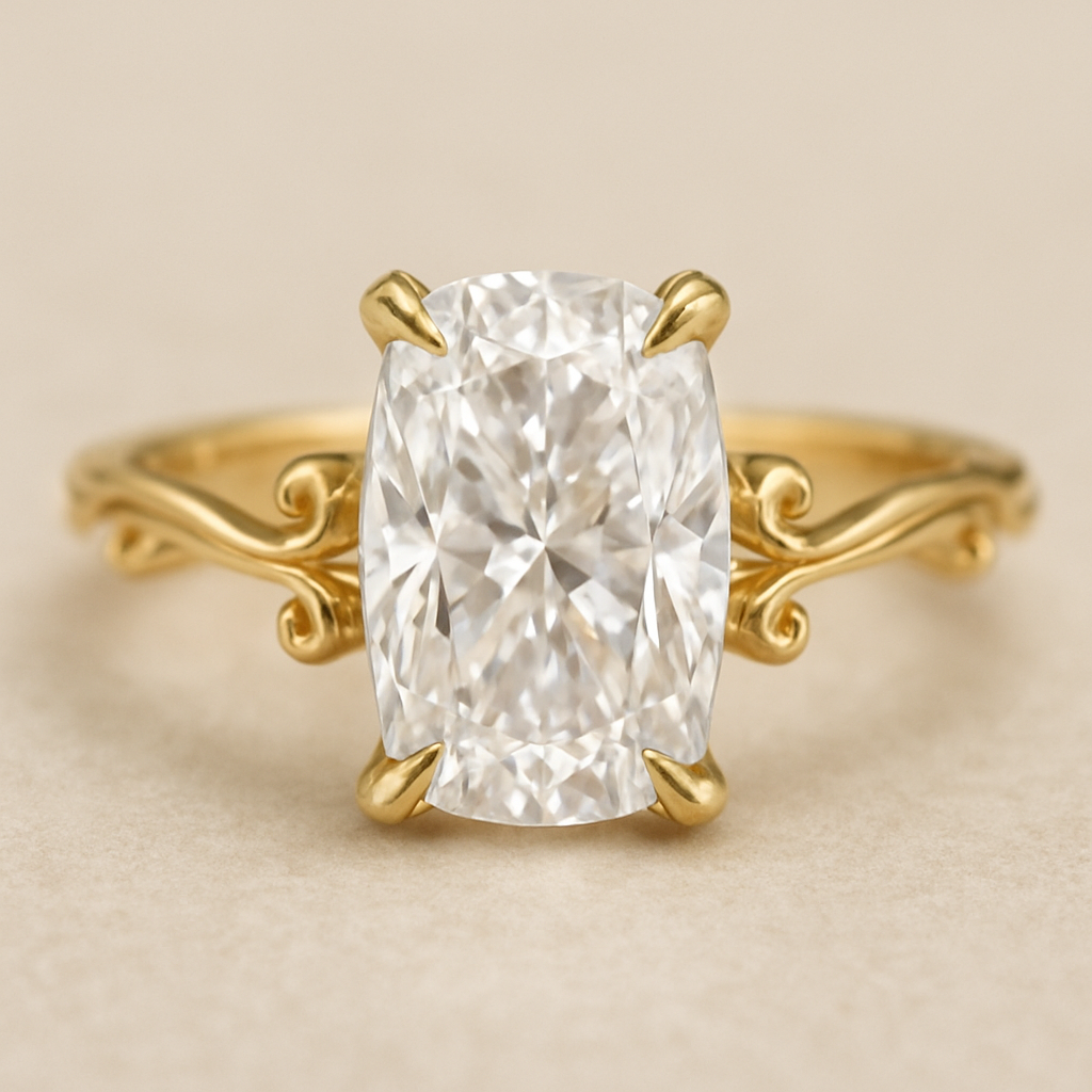 Elongated cushion diamond in yellow gold with Talon prongs at north south east and west Talon prongs, romantic style