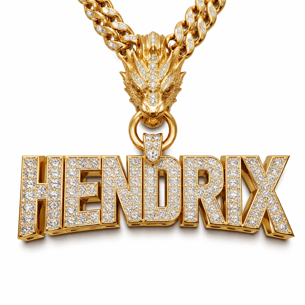 Gold pendant saying HENDRIX covered in diamonds with dragon face on the hook where the chain goes through