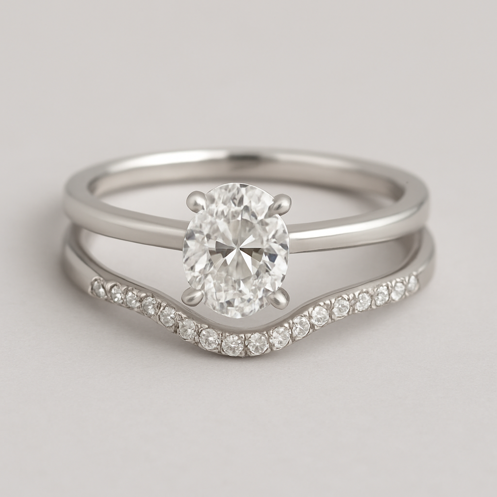 Minimalist jewelry: Platinum solitaire ring, 1.5ct oval diamond. Curved wedding band, 25 small round diamonds, claw setting. Minimalist style.
