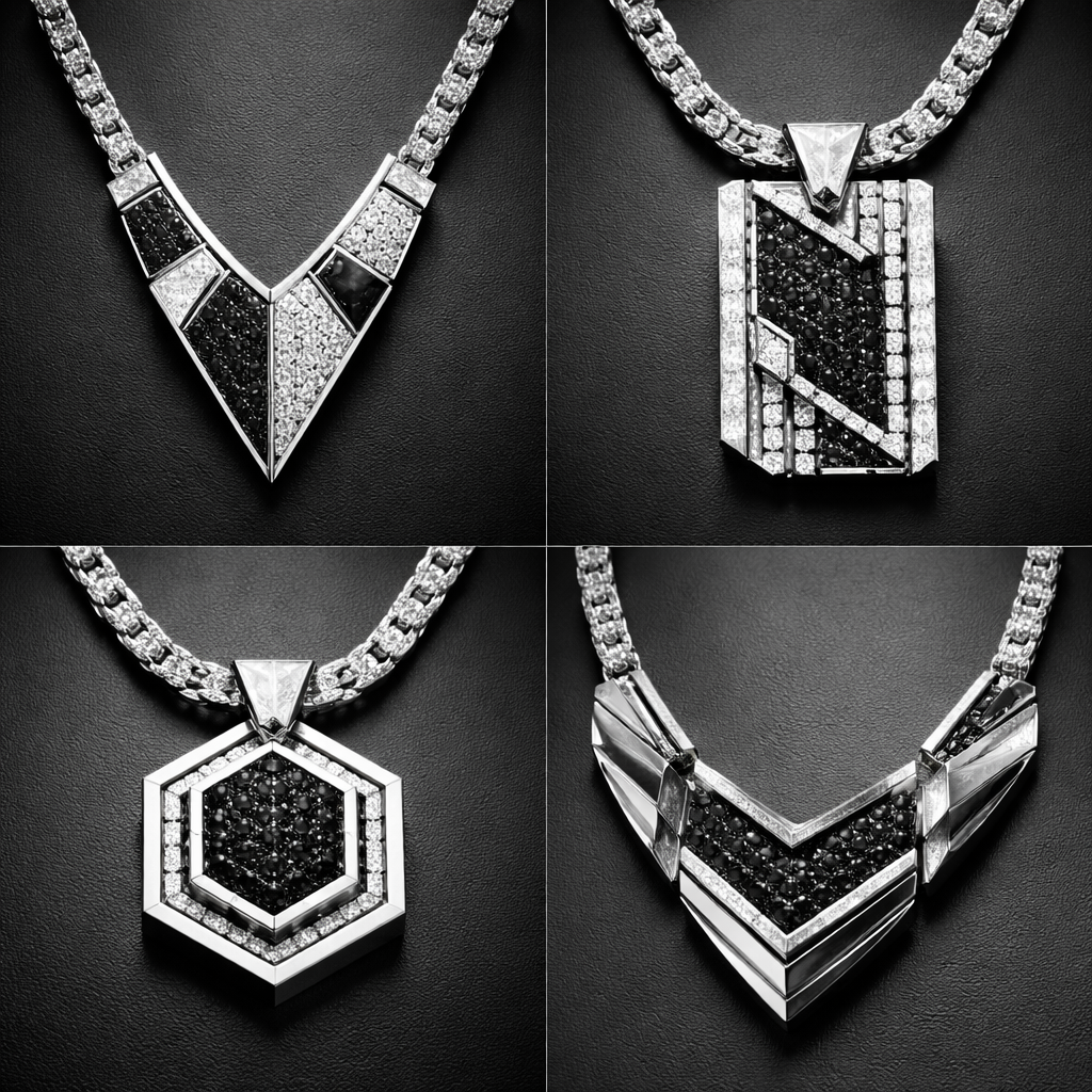 Geometric necklas for men of different angles and shapes and of white and black diamonds