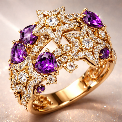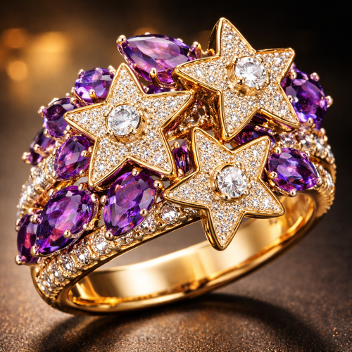 A luxury women's ring made of gold with amethyst stones suitable for party. une bague en forme de étoiles et le diamant ...
