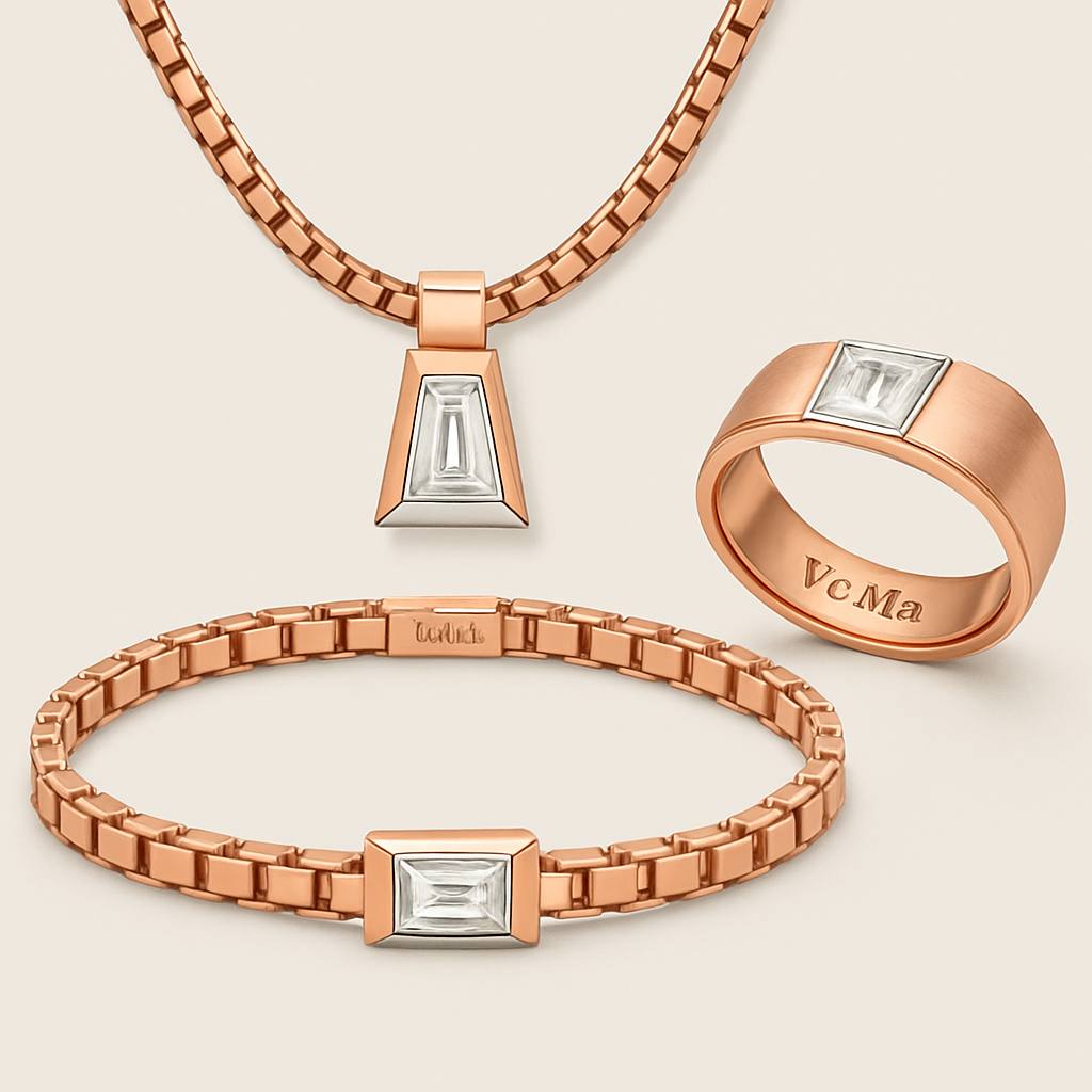 Eckige Kette und Armband und Ring 1cm breit in rosé und Silber Front gemischt mit einem Diamanten in Form eines Trapez in weiß und rosa alle Gravur VeMa innen, luxury style