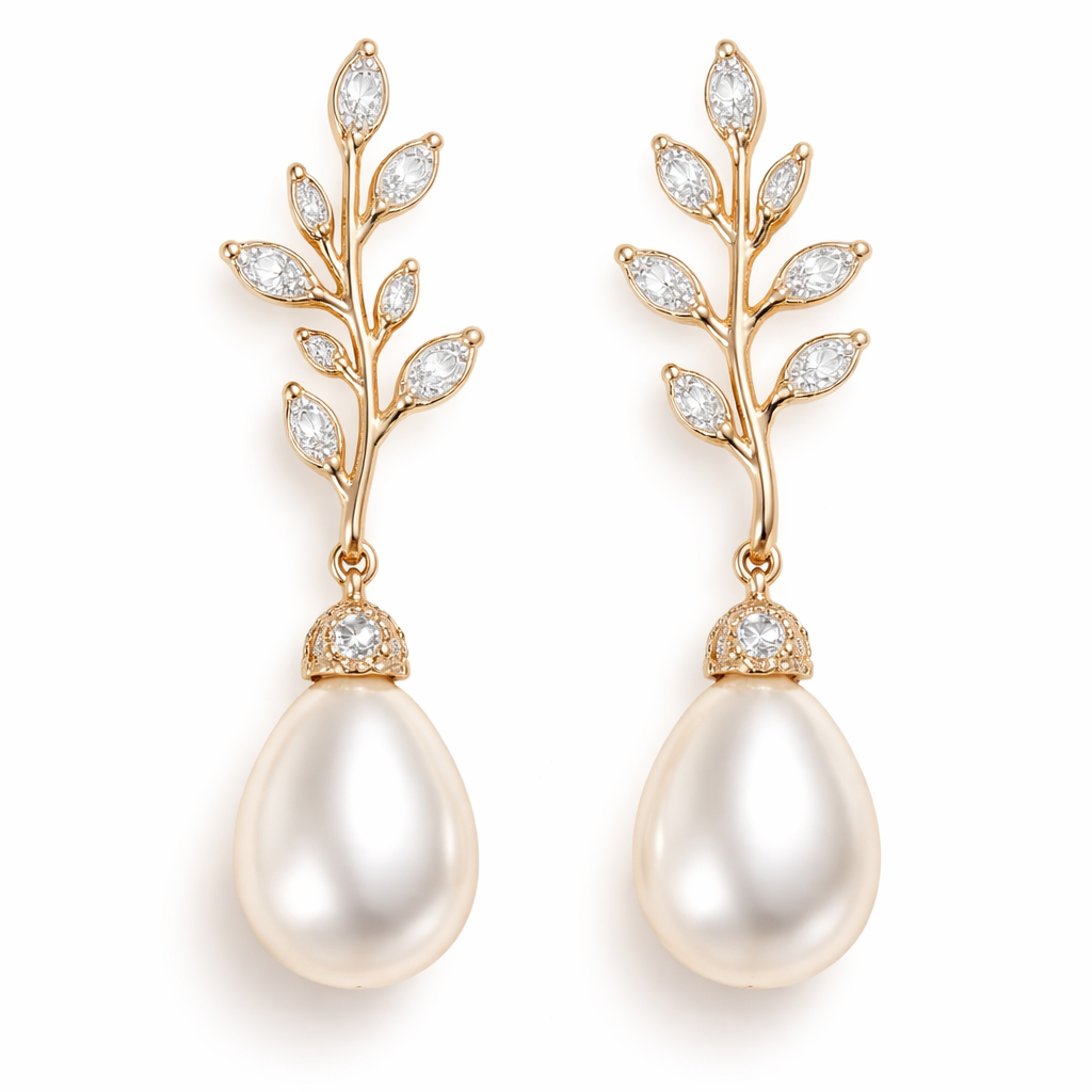 Gold pearl drop earrings with an olive branch design and small white diamonds