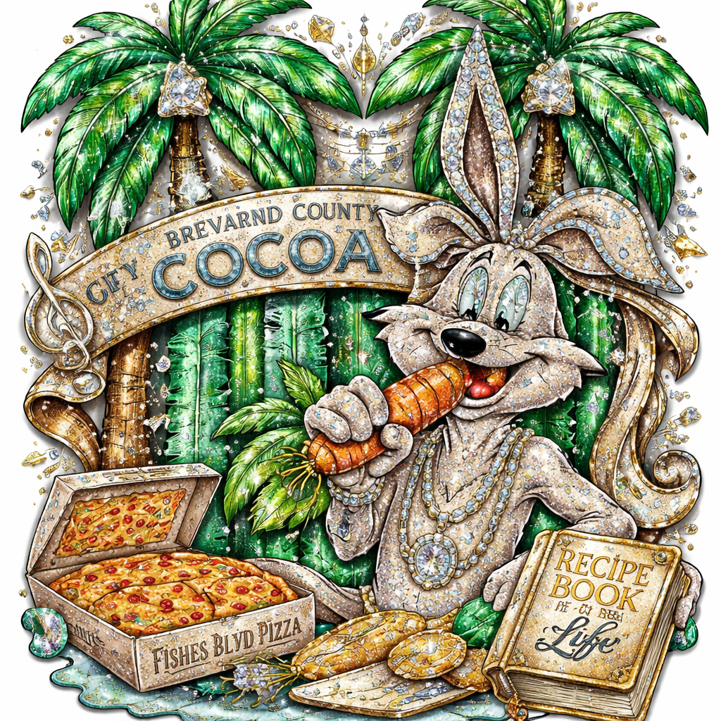 Palm trees that green emerald cut and colored shaded in layers . With buggs bunny eating an orange carrot that has solid karts orange with Brevard county city of cocoa hood magazine and a scroll with finest music notes in the shape of all angles. Add a box of fishes blvd pizza with a recipe book for life