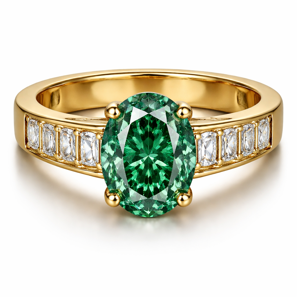 create a yellow gold ring that is 3.5mm wide on the shank with channel set 3x2.75mm emerald cut diamonds and an oval green diamond that is 14.16x9.61mm. the shank should be squared and size 11.5 There should be 8 claw prongs that go around the oval stone.