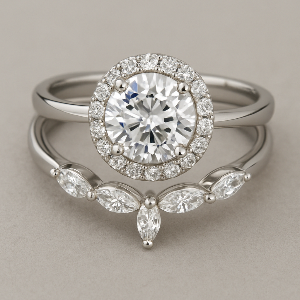 Create a fan style ring featuring a .6 marquise diamond in the center with a .25 carat round stone directly underneath s...