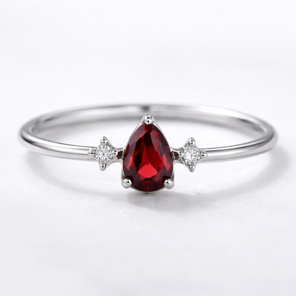 A minimalist women's ring made of silver with garnet stones suitable for daily wear. anel com pedra central em gota com duas estrelas de 6 pontas ao lado., minimalist style