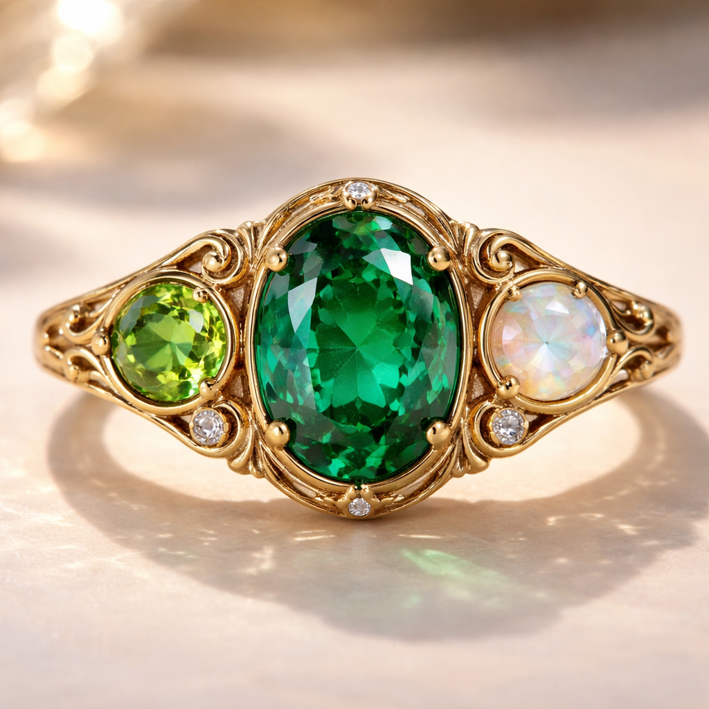 Gold ring, big oval emerald in the middle. One side a peridot, one side an opal. All bezel , art_nouveau style