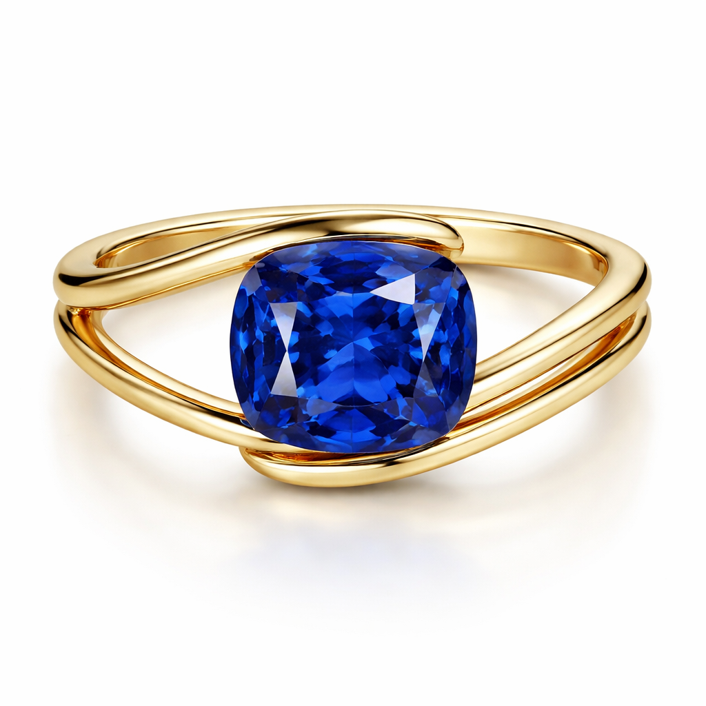 Sapphire 3,28 carat royal blue cushion. Need ring without any additional stones but something not classic. Yellow gold. Not too much gold. Stone between two lines of gold beautiful